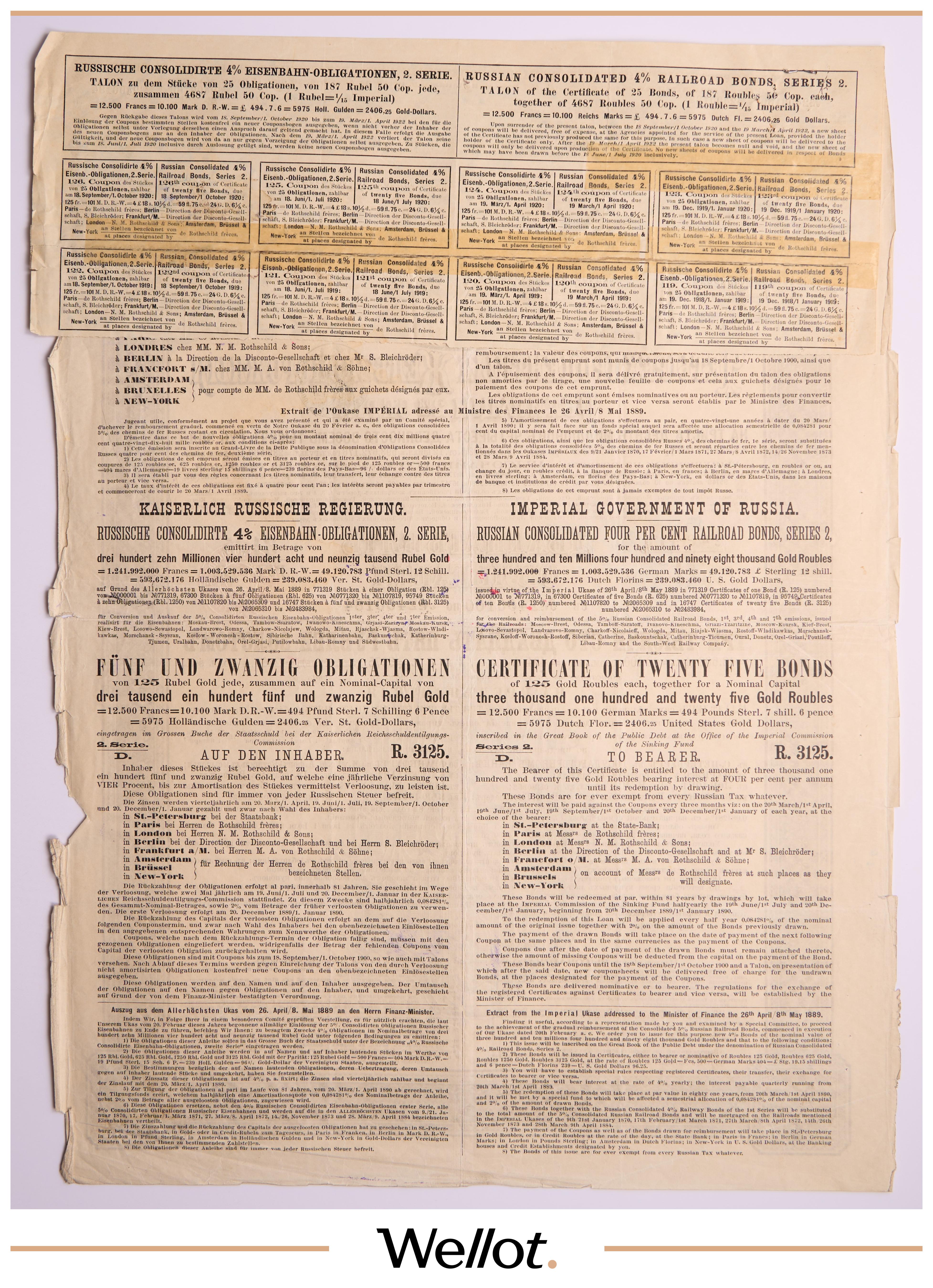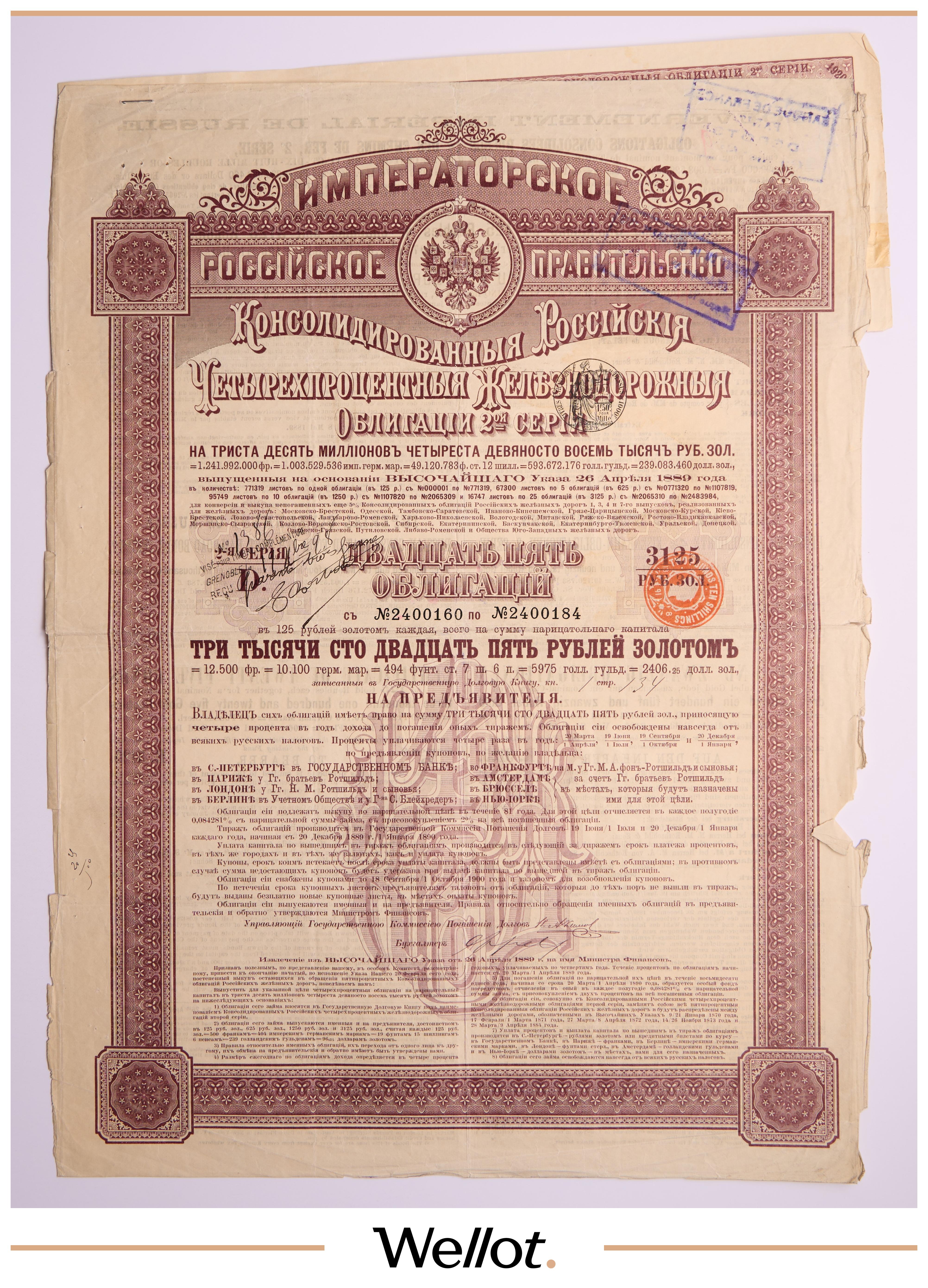 3125 Рублей Золотом 1889 Российская Империя 4% Консолидированная Железнодорожная Облигация