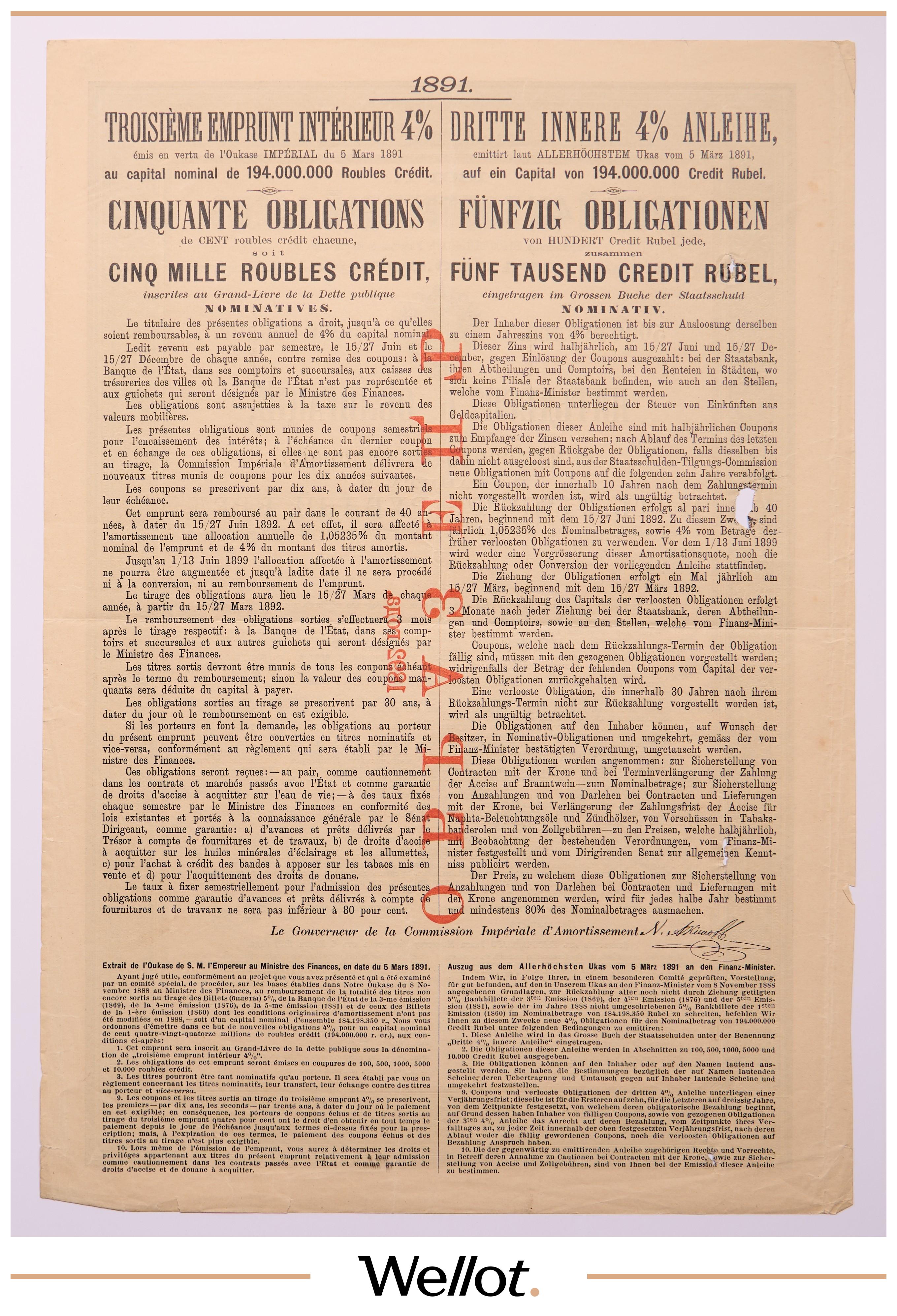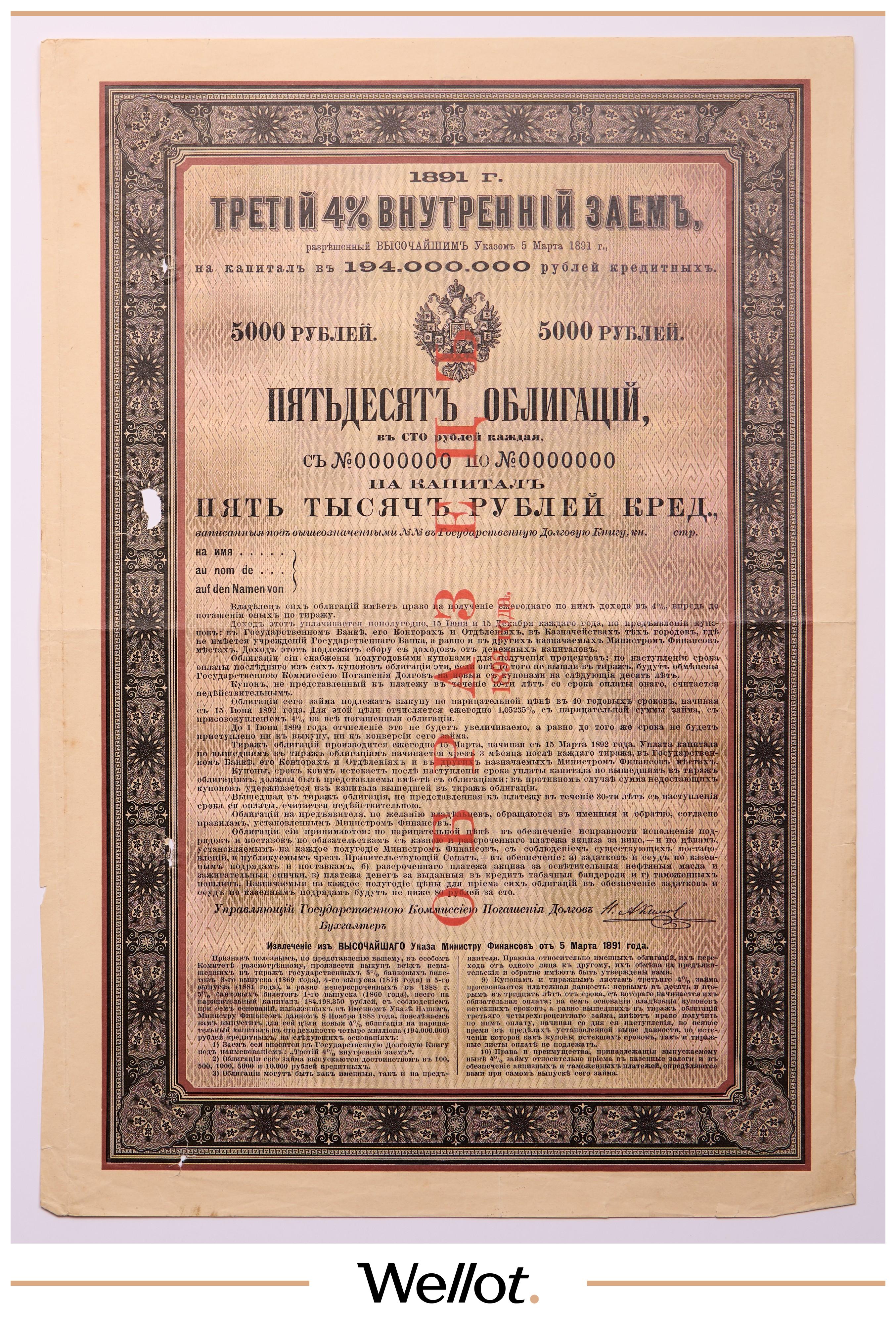5000 Рублей Кредитных 1891 Российская Империя Третий 4% Внутренний Заем Образец