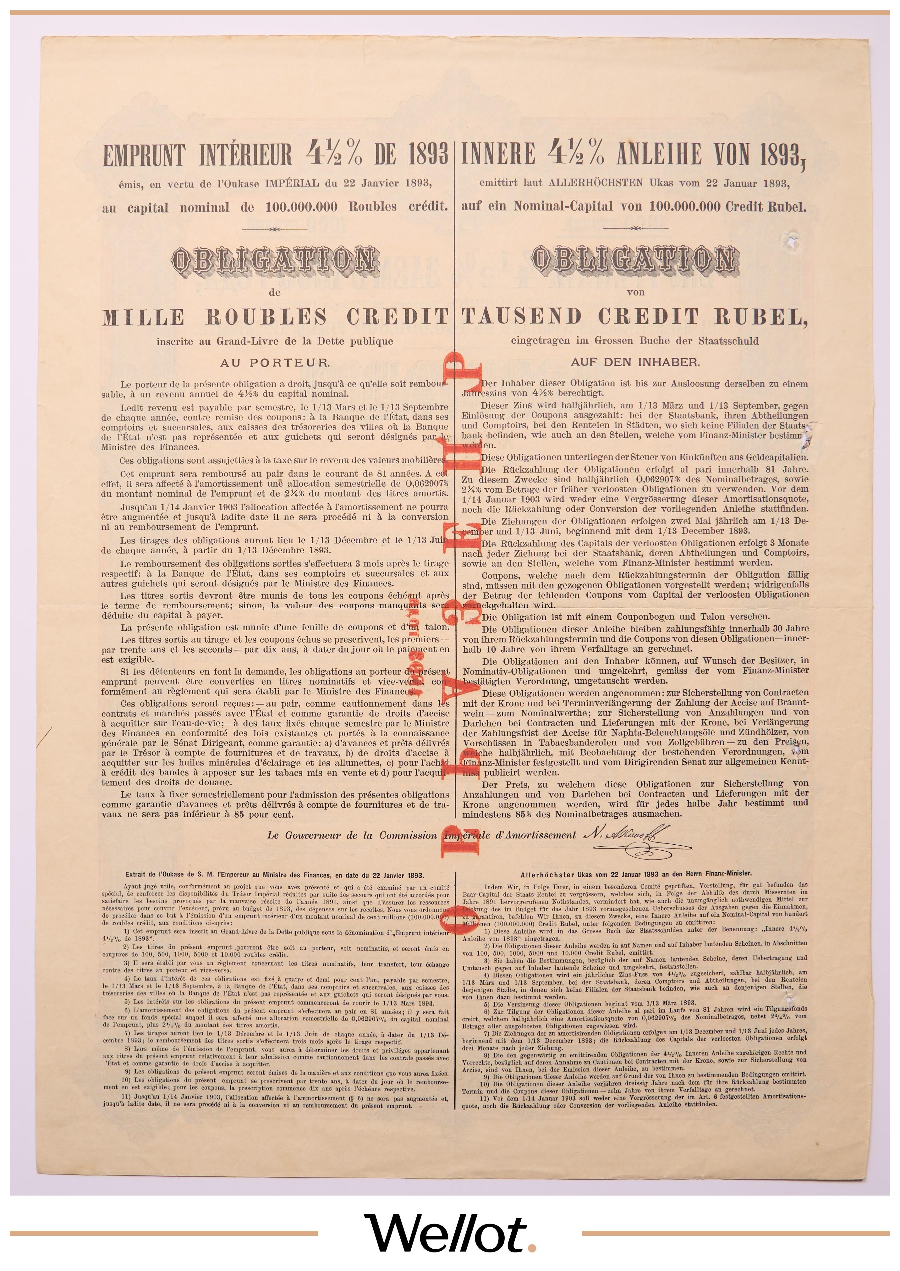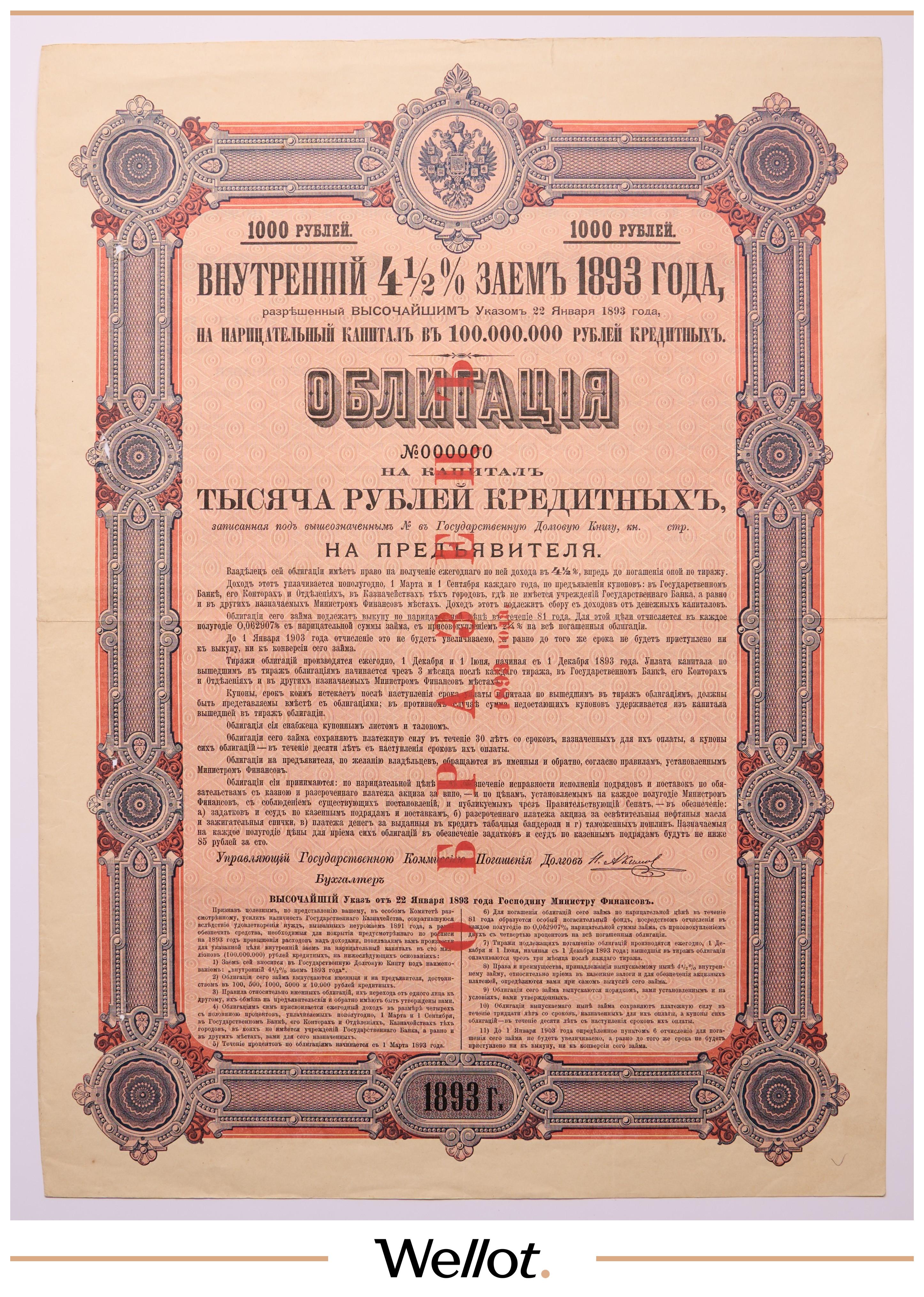 1000 Рублей Кредитных 1893 Российская Империя Внутренний 4,5% Заем Образец