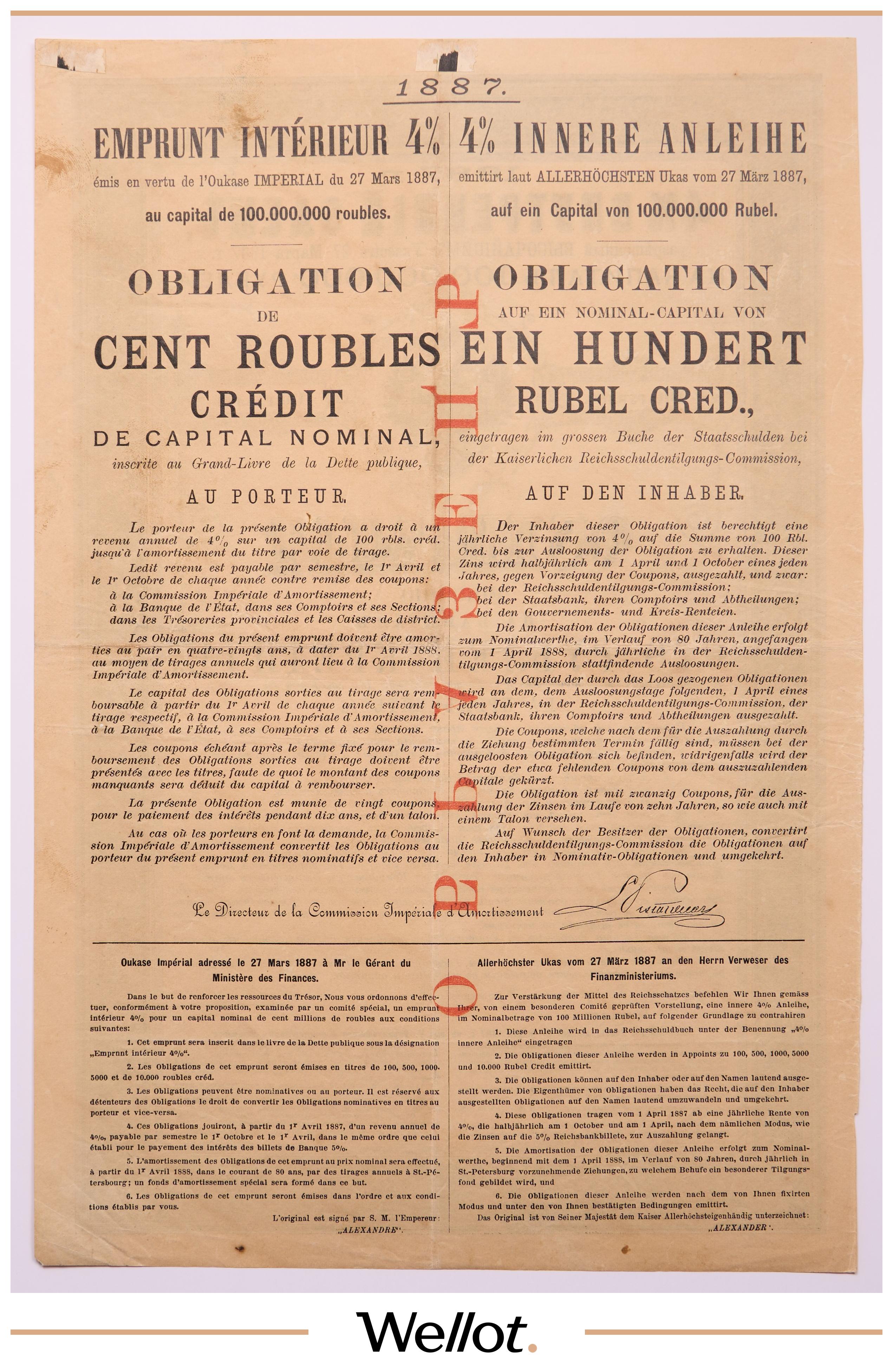 100 Рублей Кредитных 1887 Российская Империя 4% Внутренний Заем Образец