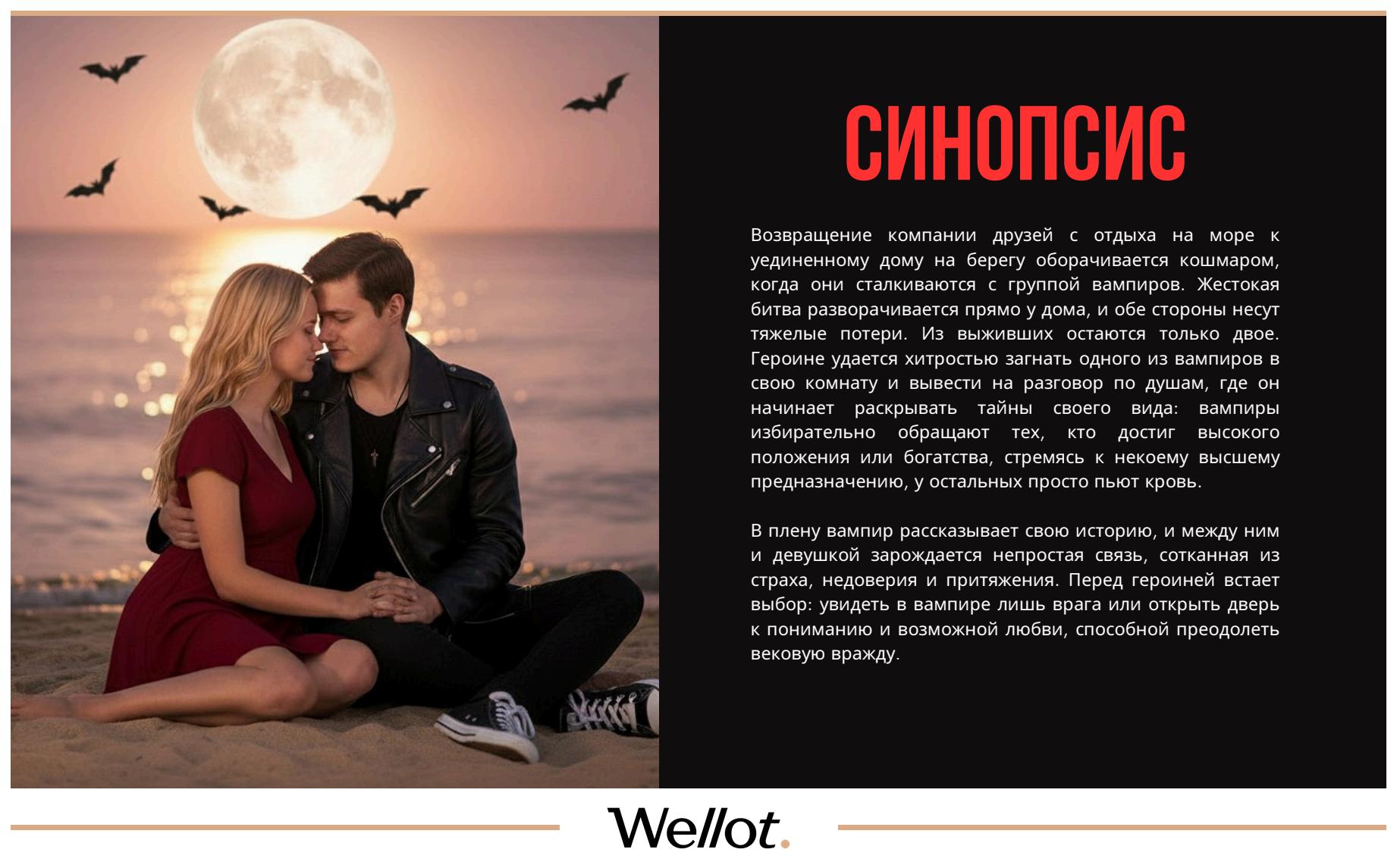 Ваша роль — состоятельная личность с собственным бизнесом и высоким статусом, которая всего добилась самостоятельно: связи, влияние и капитал — результат ума, смекалки и сильных коммуникативных навыков. Именно такие люди особенно ценны для клана: харизматичный лидер стремится собрать «бессмертное общество» выдающихся интеллектуалов и новаторов, способных развивать их мир вечно. По сюжету персонаж уже «переманен» в клан: очарован романтизмом их культуры и поддался гипнотическому влиянию, но еще не обращен — идет подготовка к укусу и вечной жизни. Внутри этой линии раскрываются сомнения, борьба и притягательная, почти иллюзорная жажда скорейшего обращения. Хронометраж роли — до 7 минут экранного времени!