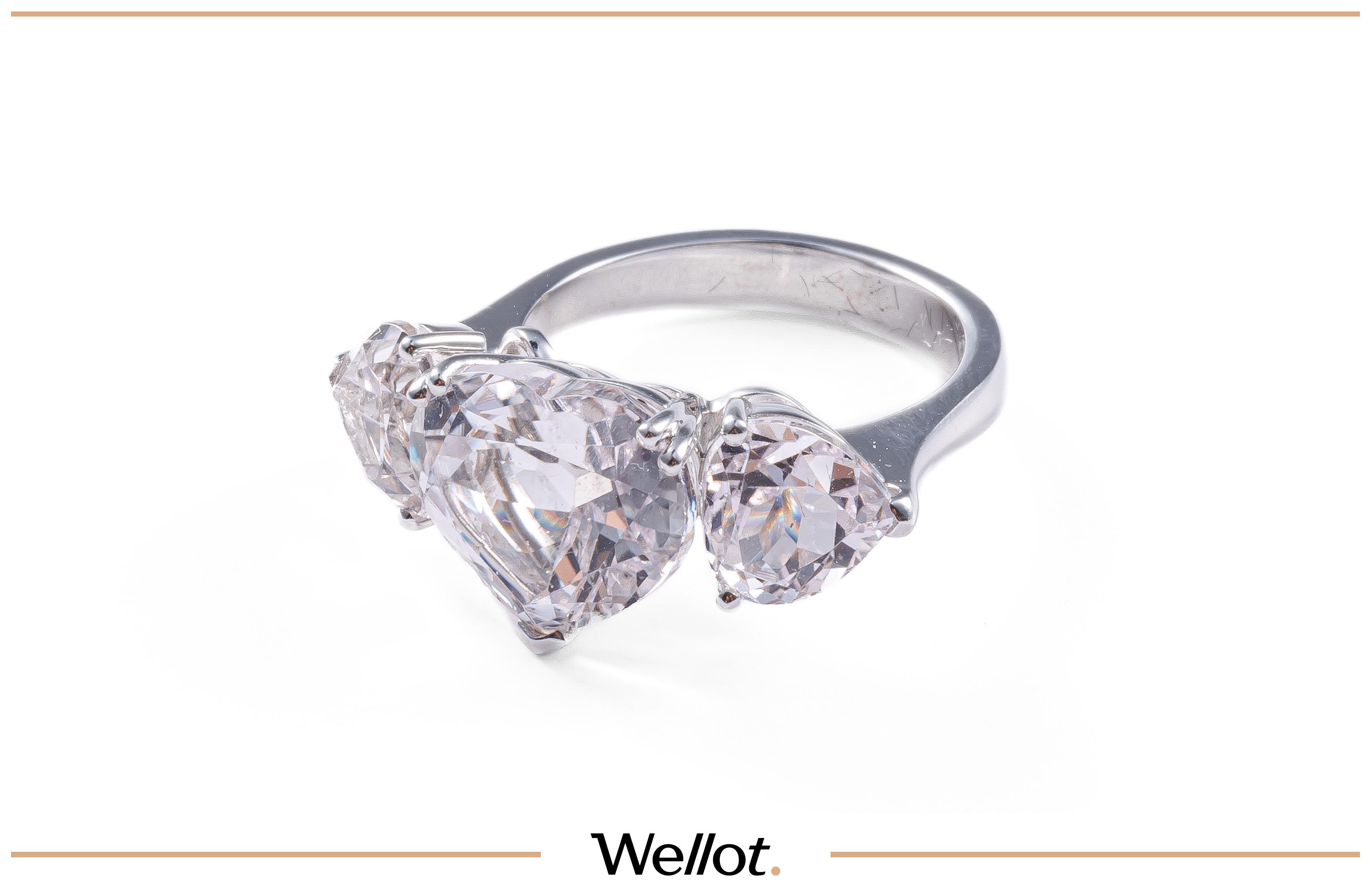 Золото 750. Центральный камень — натуральный кунцит, 5,50 ct, огранка Heart. Боковые камни — кунциты, общий вес 3,30 ct. Общий вес изделия — 5,67 г. Размер 16. Элегантное кольцо с натуральными кунцитами нежного розово-лилового оттенка. Центральный камень отличается выразительной игрой света и мягким пастельным сиянием, характерным для высококачественных кунцитов. Композицию дополняют боковые кунциты, гармонично подчеркивающие центральный камень и создающие сбалансированный ювелирный силуэт. Изящное украшение с редким по чистоте и оттенку камнем, сочетающее утончённость дизайна и выразительную природную красоту кунцита.
