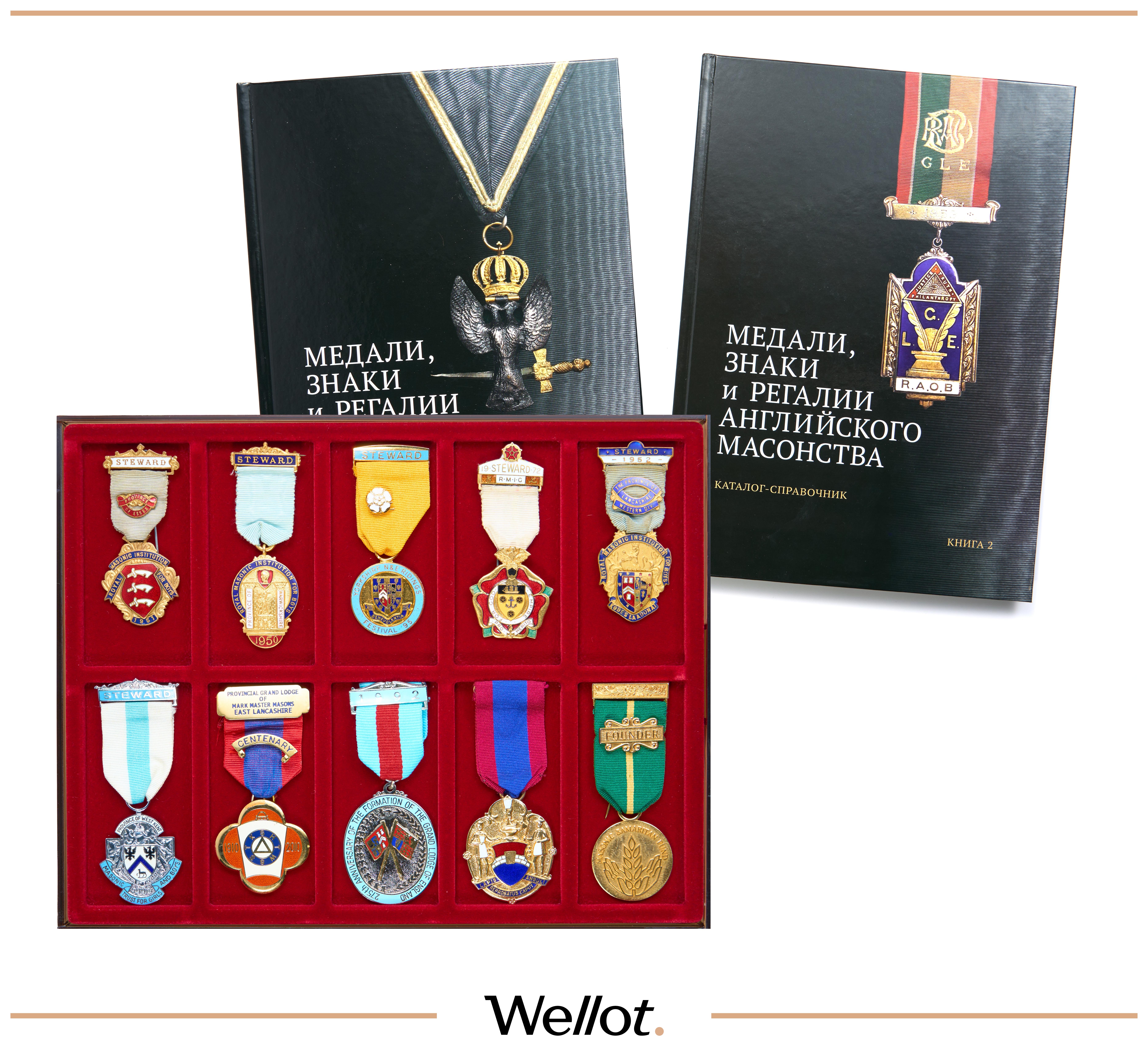 Каталог-справочник «Медали, знаки и регалии английского масонства» выпущен в двух томах совместно с аукционным домом Wellot. Книги написаны на базе коллекции Меренкова Вадима Леонидовича (02.01.1949 — 15.12.2021) — одного из крупнейших собраний масонских знаков, которое готовится к экспозиции совместно с нашим аукционом. Лот включает 12 масонских знаков и книги, подписанные сыном автора. Первые и единственный подписанный экземпляр издания.