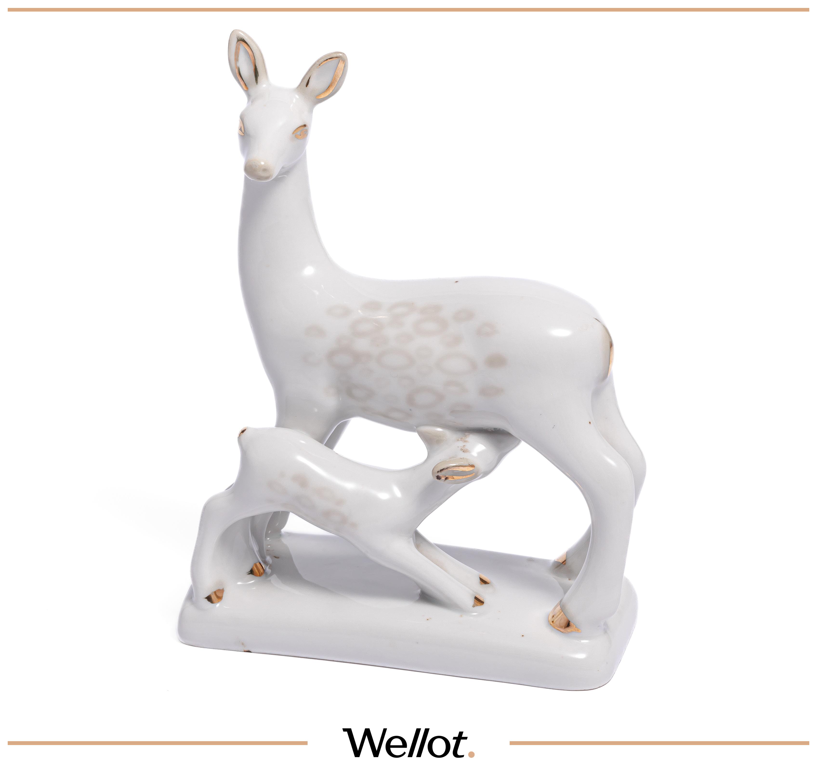 Белый фарфор. Размер: 12 см х 5.5 см х 16 см. Чудовский фарфоровый завод «Красный фарфорист». Композиция «Материнство». Изящная анималистика середины 1950-х, популярная у коллекционеров советского фарфора.