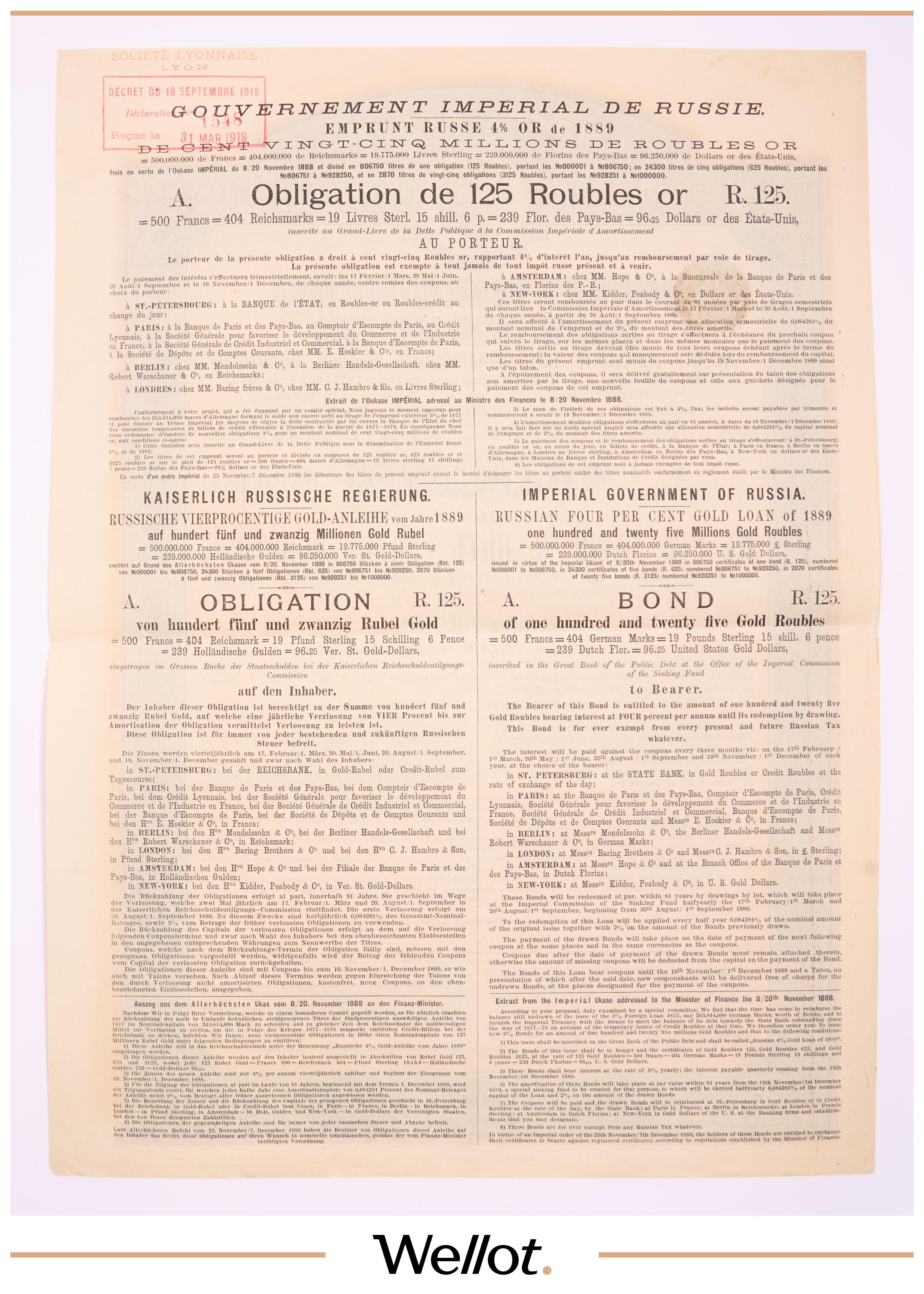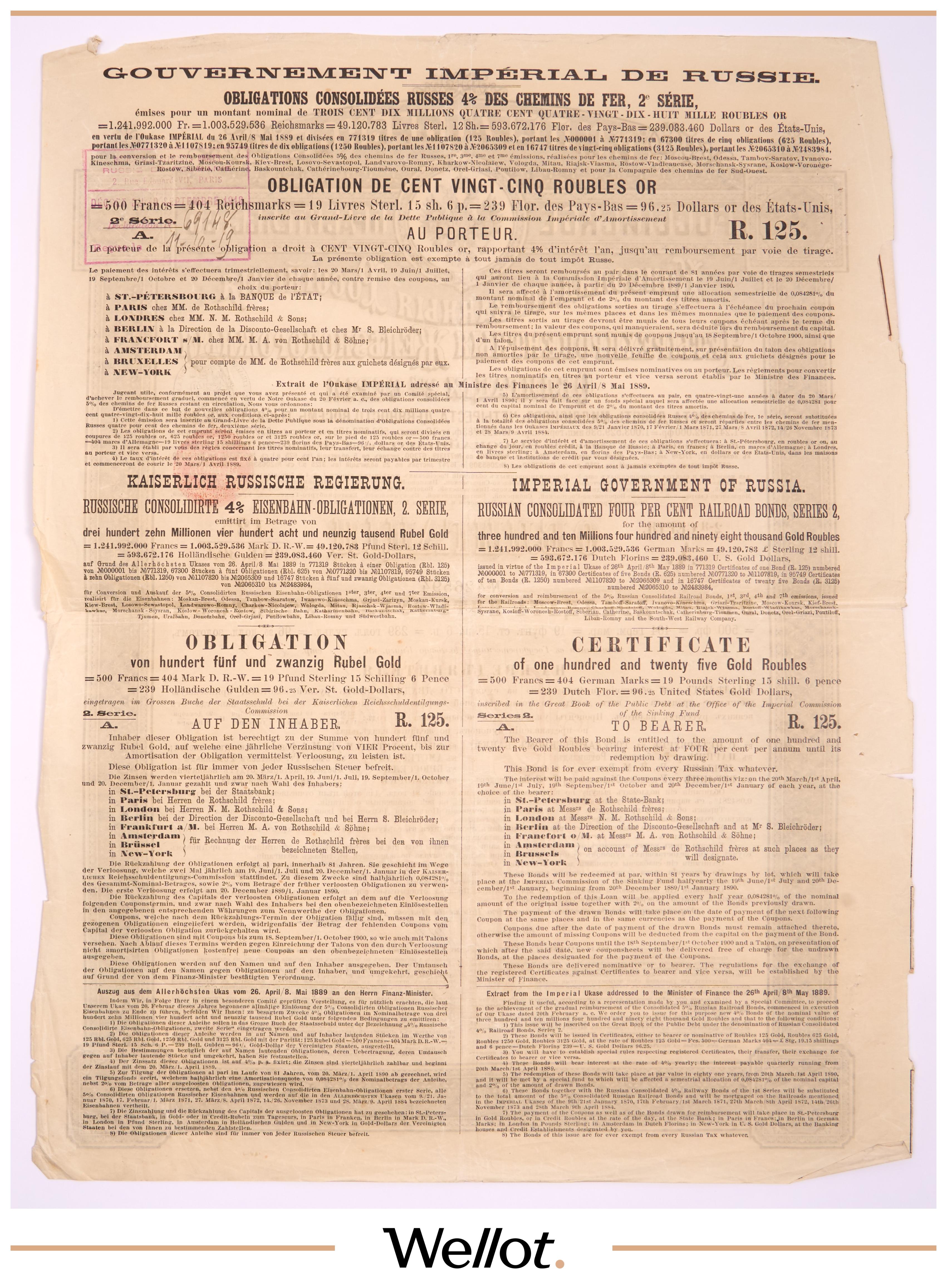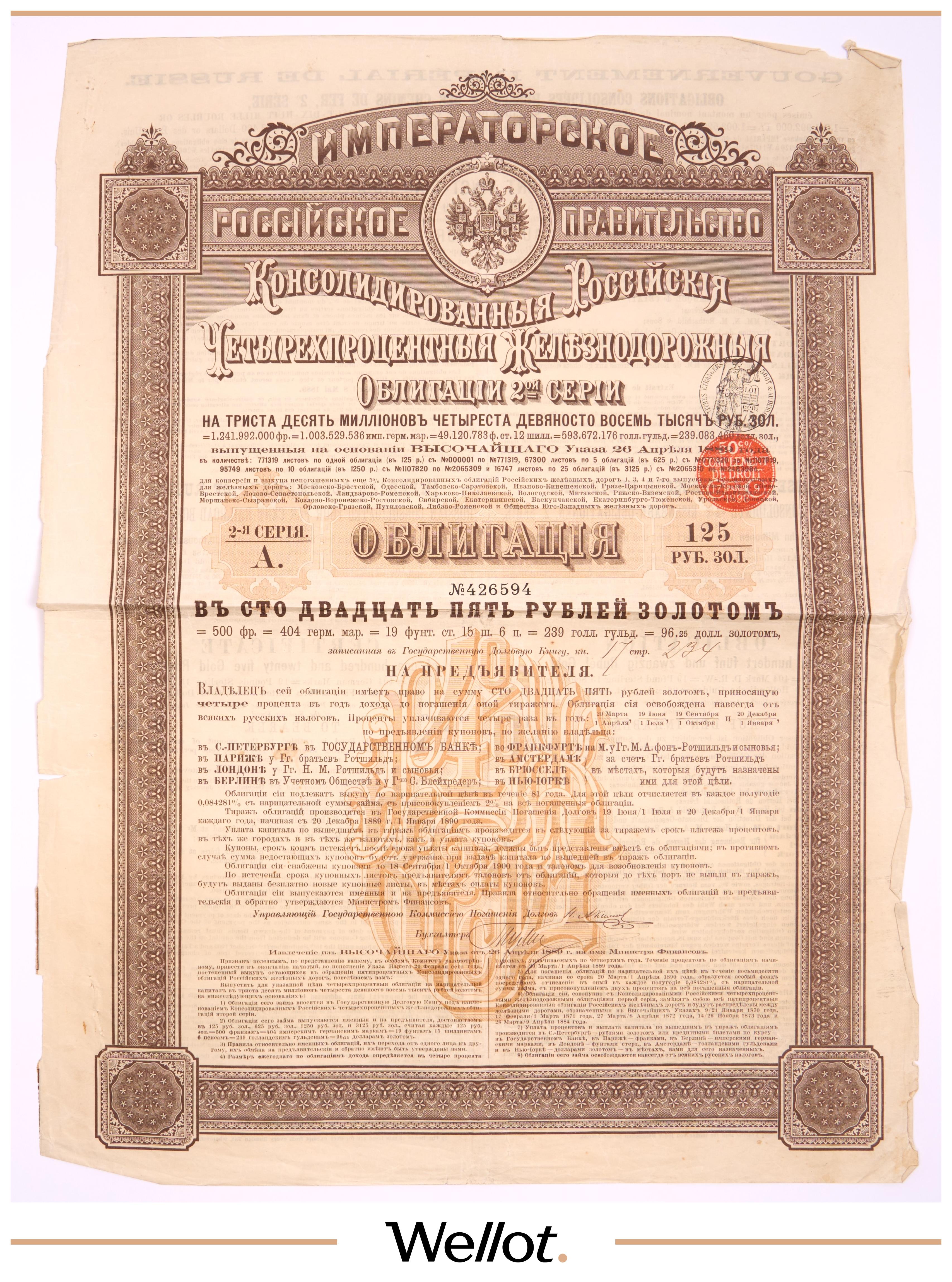 125 Рублей Золотом 1889 Российская Империя 4% Консолидированная Железнодорожная Облигация