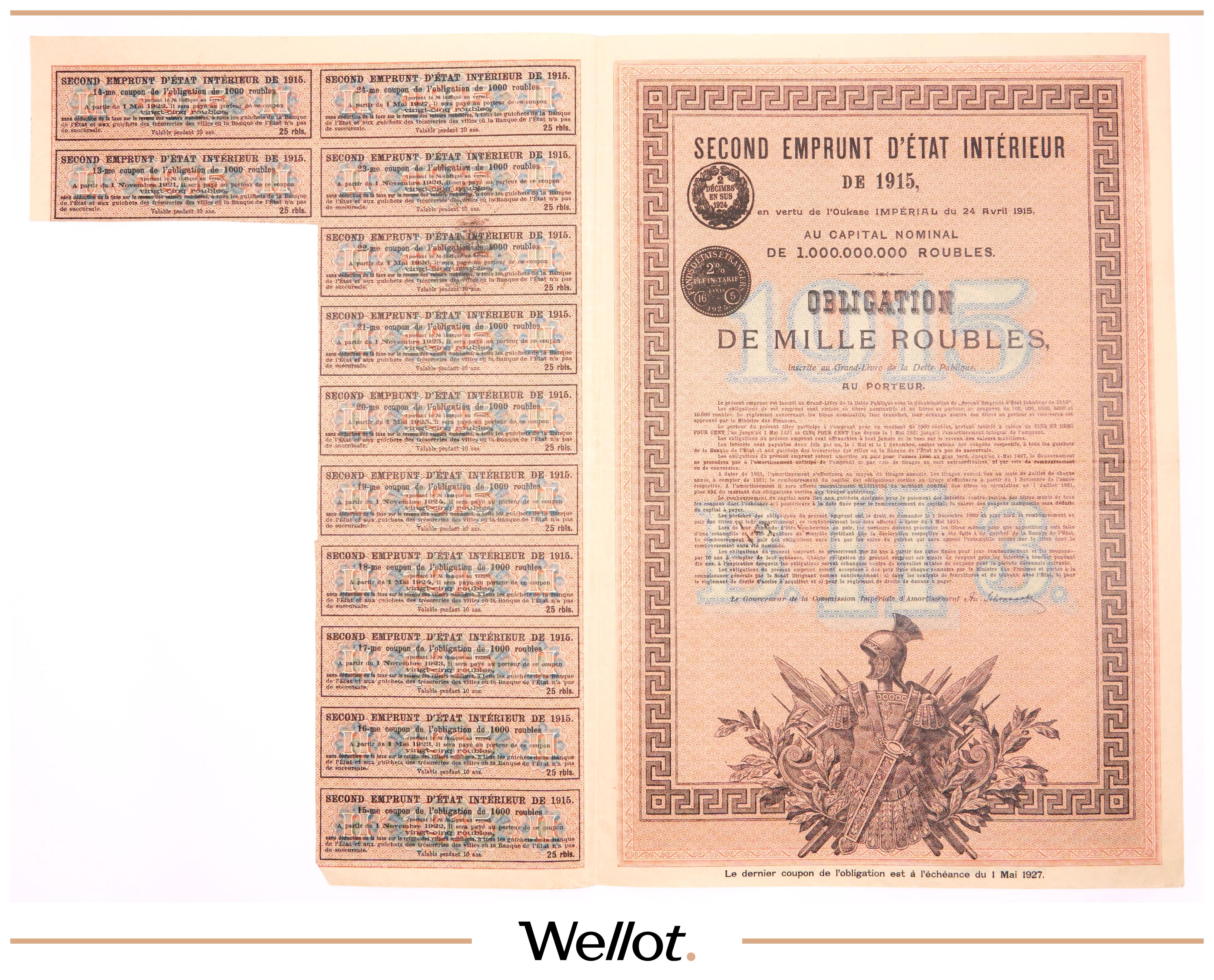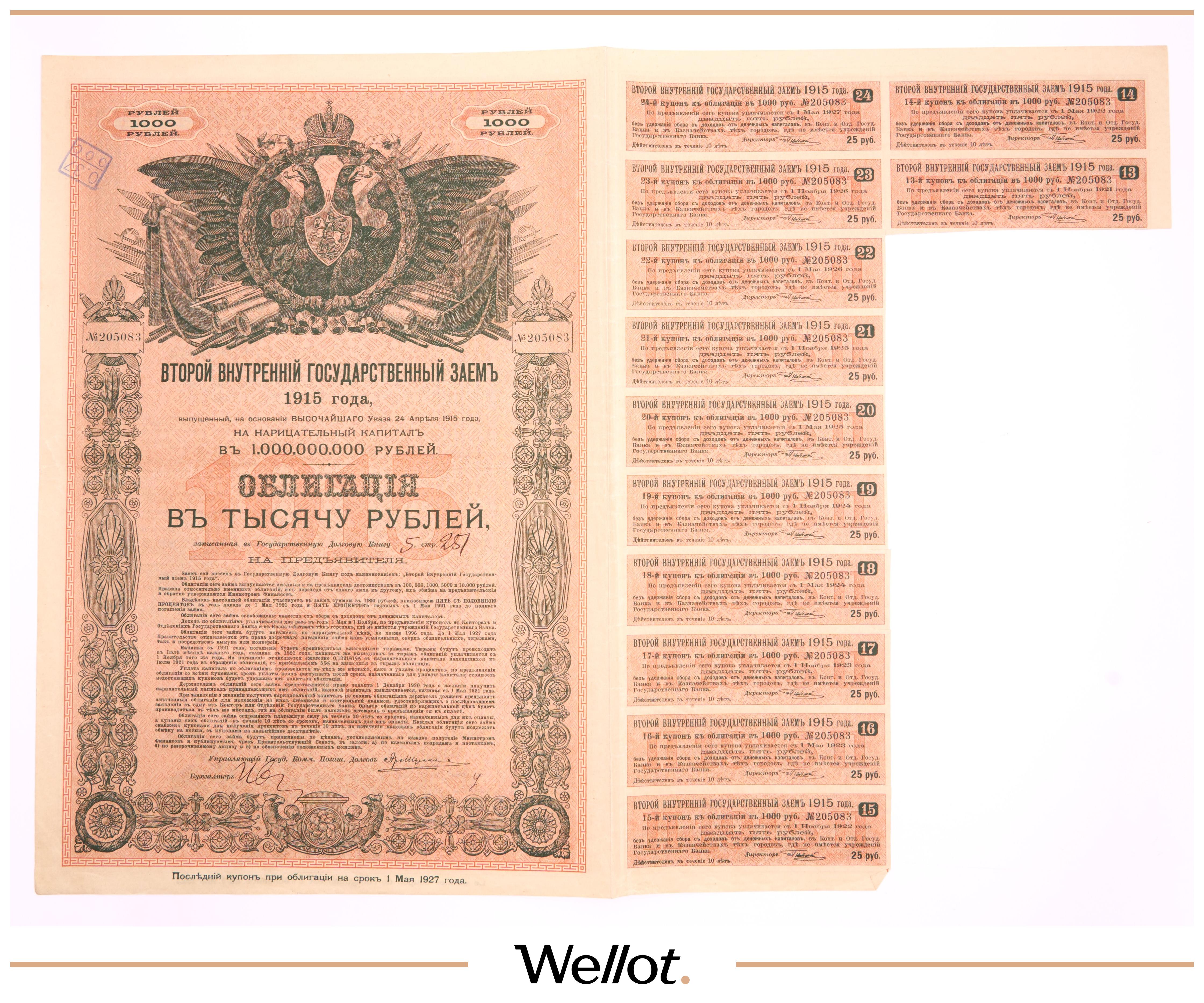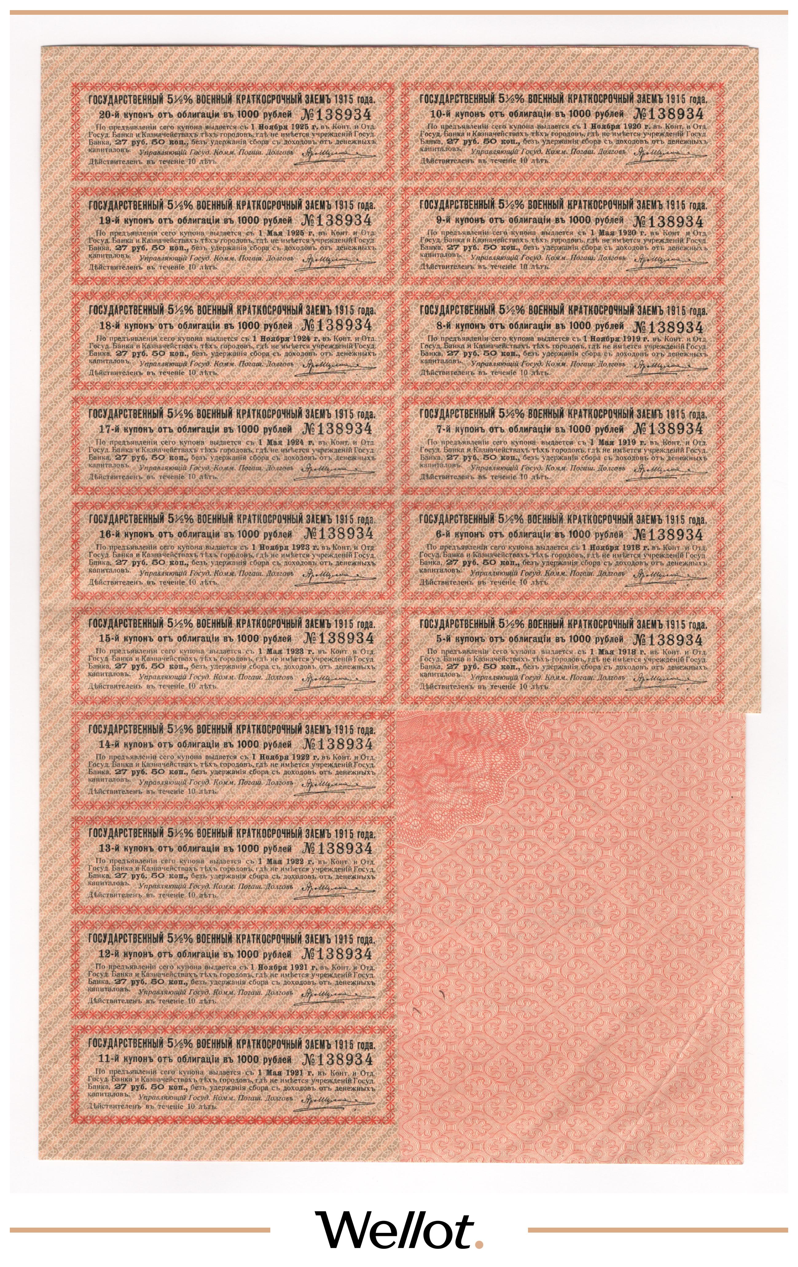 1000 Рублей 1915 Российская Империя Государственный 5,5% Военный Краткосрочный Заем