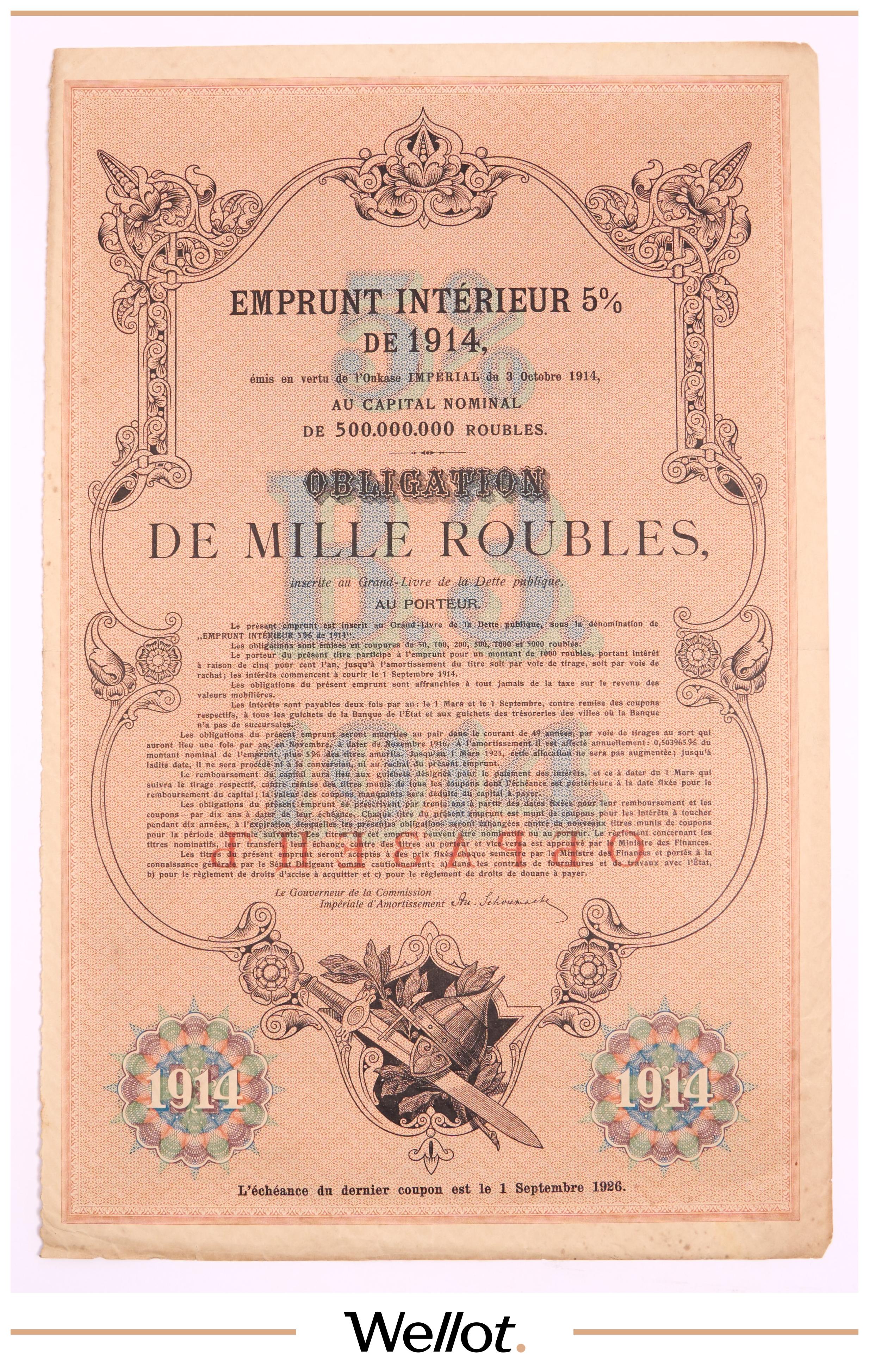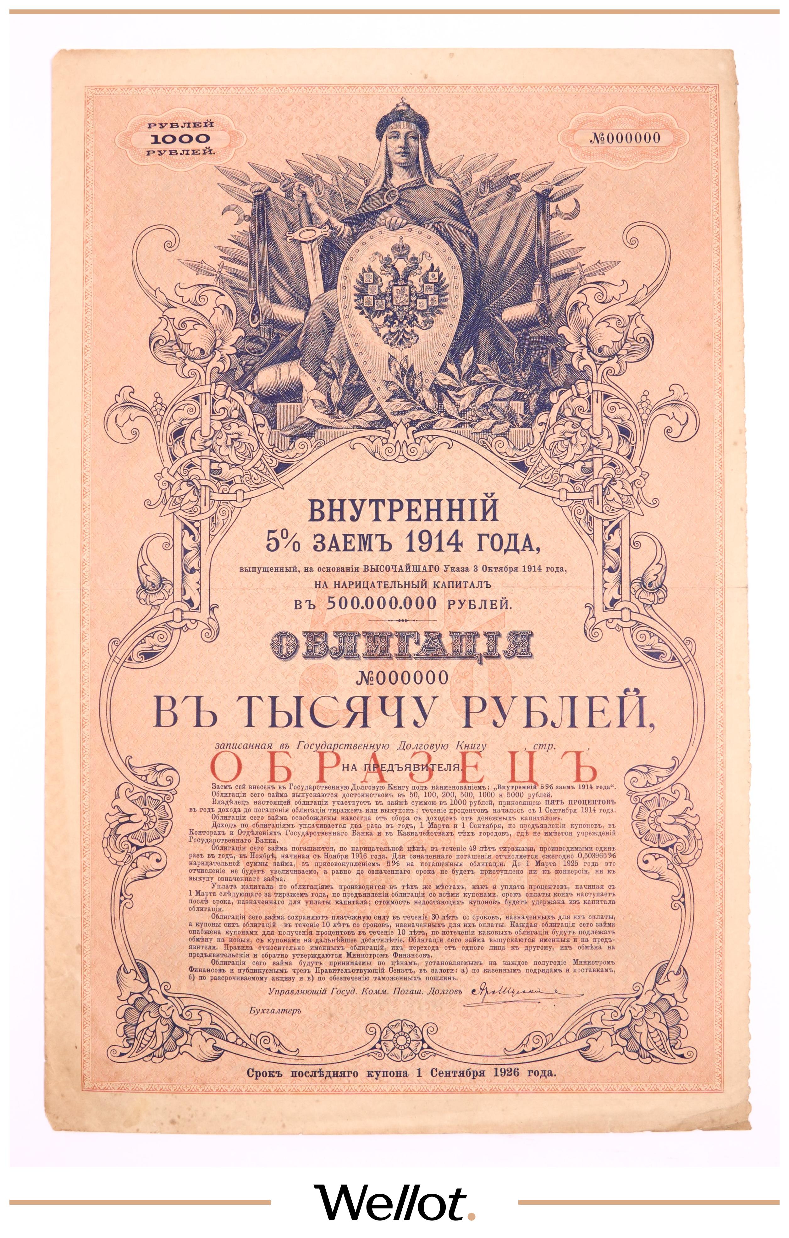 1000 Рублей 1914 Российская Империя Внутренний 5% Заем Образец