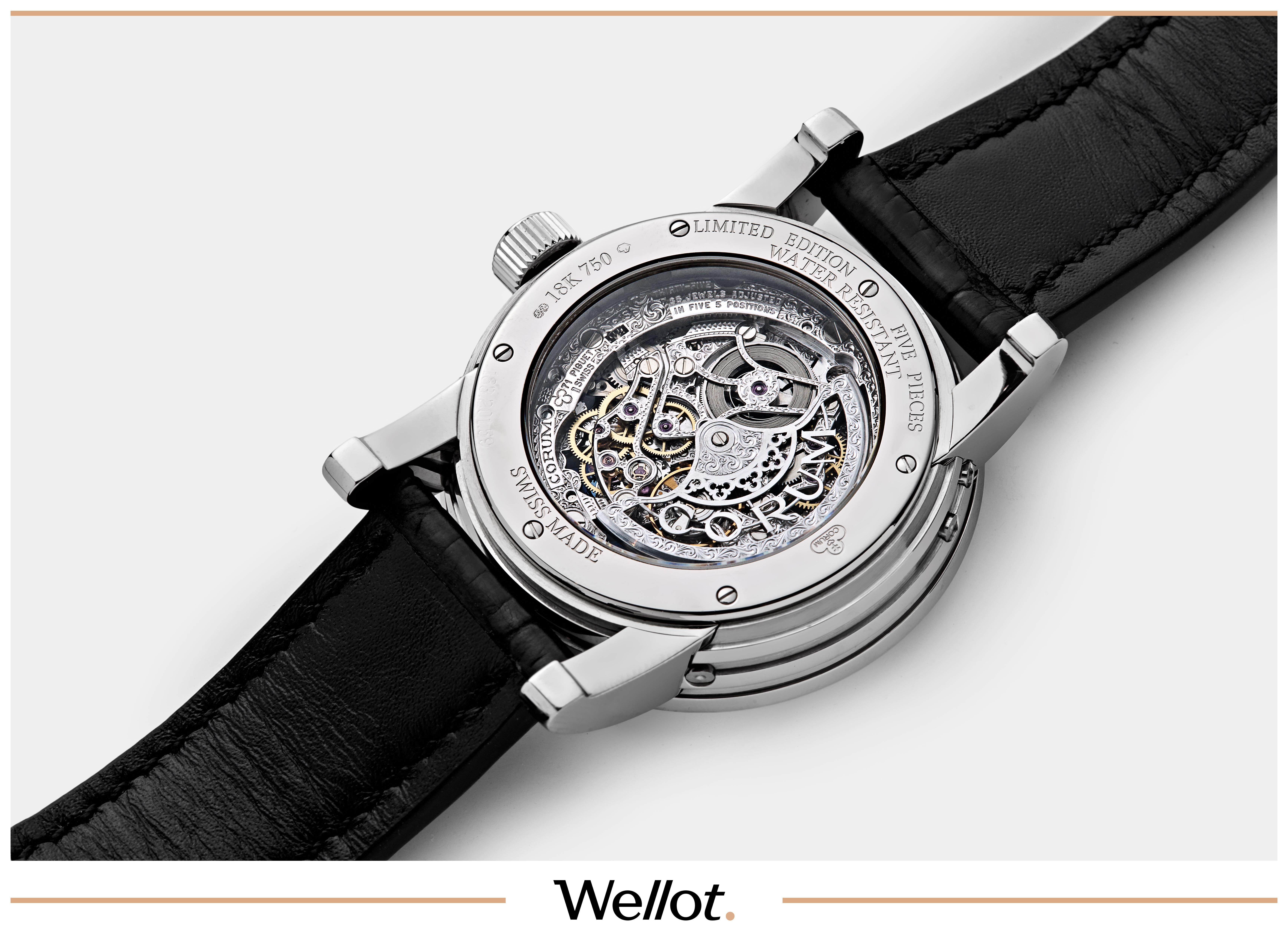 Белое золото. Размер корпуса: 42 мм. Циферблат: скелетон / перламутр. Автоподзавод, вечный календарь. Водостойкость 20 метров. Редчайшая модель, выпущенная лимитом в 5 экземпляров.