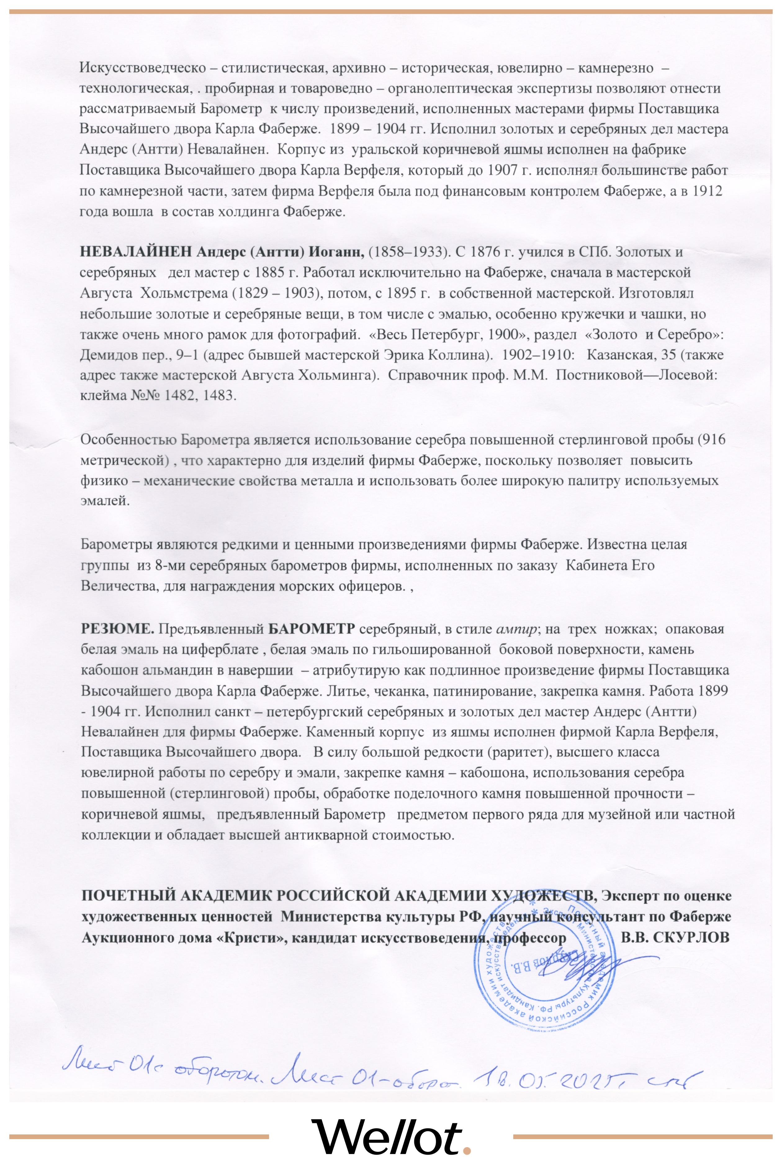 На данный предмет имеется экспертное заключение за подписью научного консультанта по Фаберже Аукционного дома «Кристи», кандидата искусствоведения, профессора Скурлова В.В