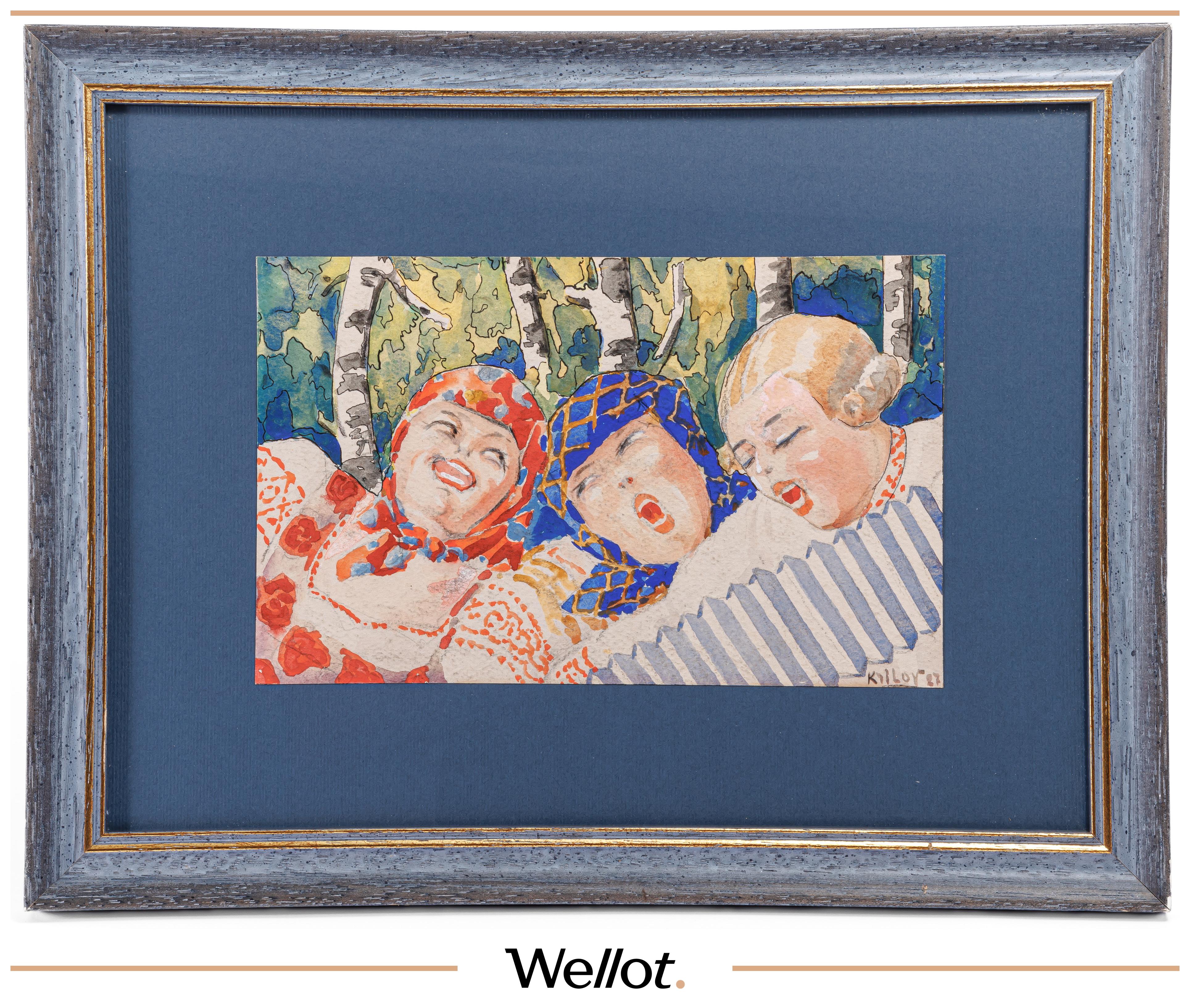 Тема коллекционирования: советская живопись. Бумага, акварель, гуашь, тушь, белила, 22,4×14 см (без паспарту и рамы). Габариты в раме 28,4х36 см. В правом нижнем углу авторская подпись и дата: «Krilov1927». Красочная работа, отражающая колорит эпохи раннего СССР.