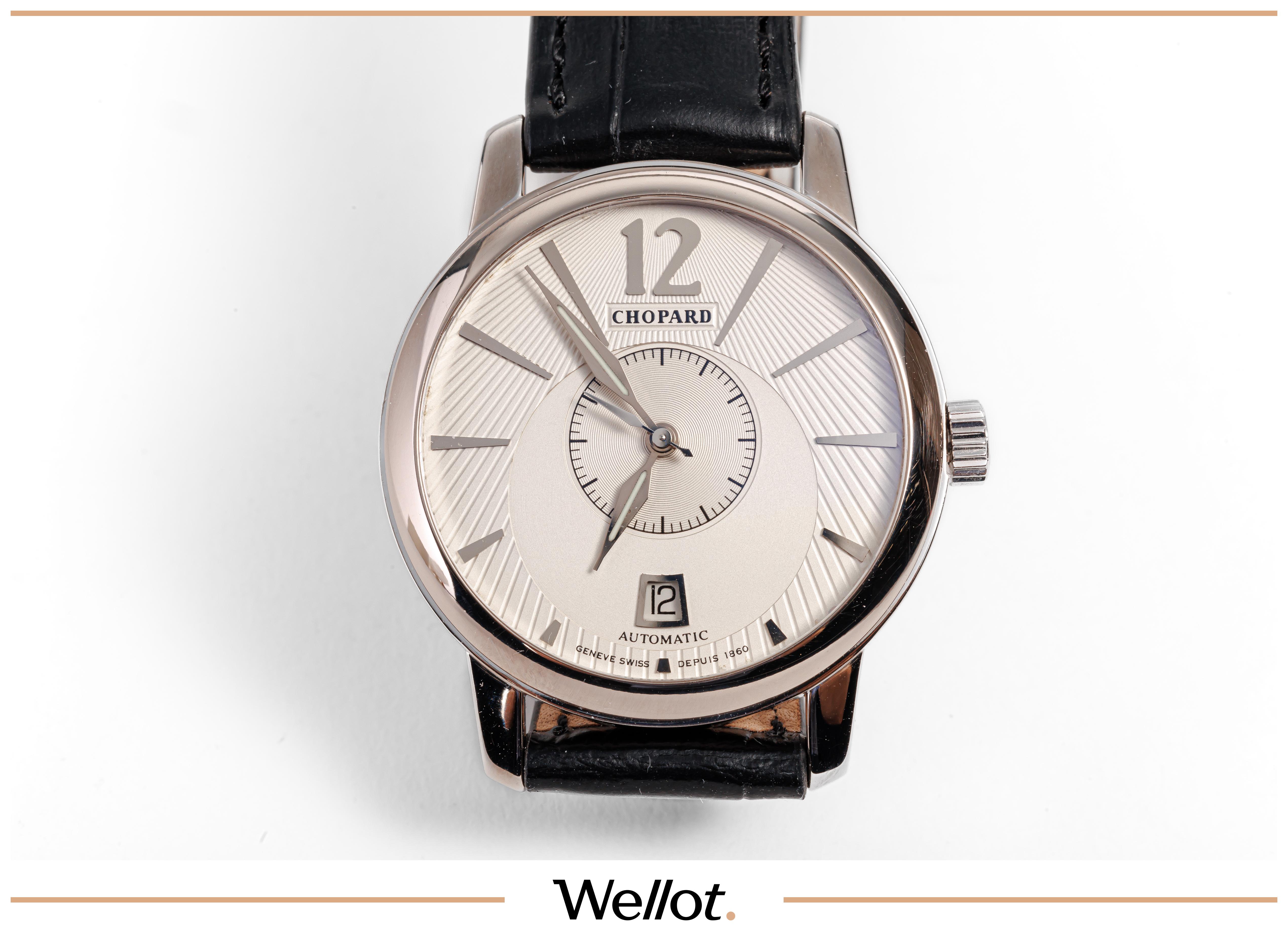 Тема коллекционирования: часы. Белое золото 22 карата. С памятной надписью на обороте. Уникальный предмет с редким провенансом: 28 мая 2005 года на трассу L.U.C. Chopard Classic Weekend Rally вышло более 40 экипажей, и именно эти часы были вручены победителям соревнований за 2‑е место — экипажу на MGA 1600 (1964). Не просто «люкс», а памятная награда, которая превращает аксессуар в коллекционный трофей!