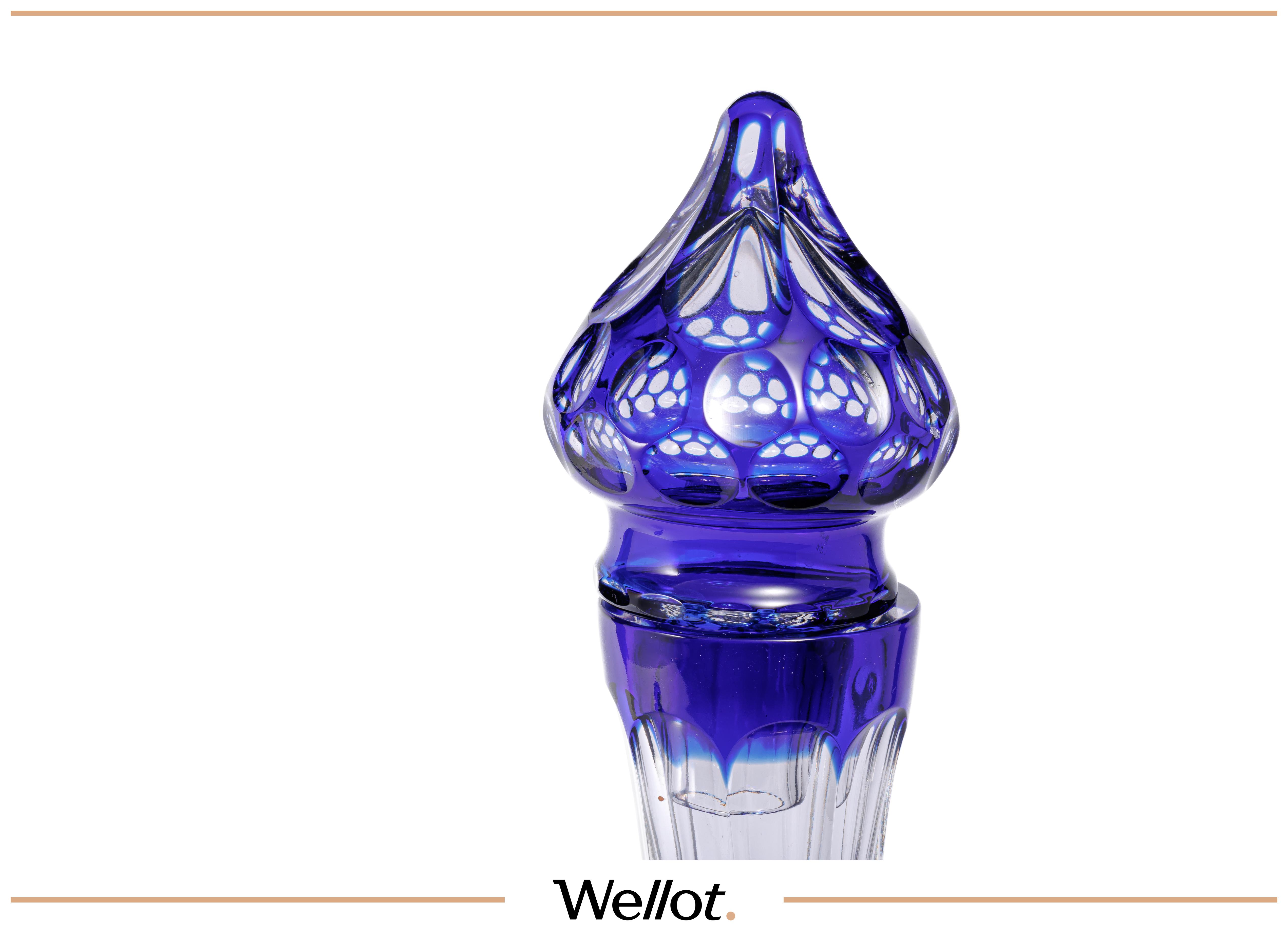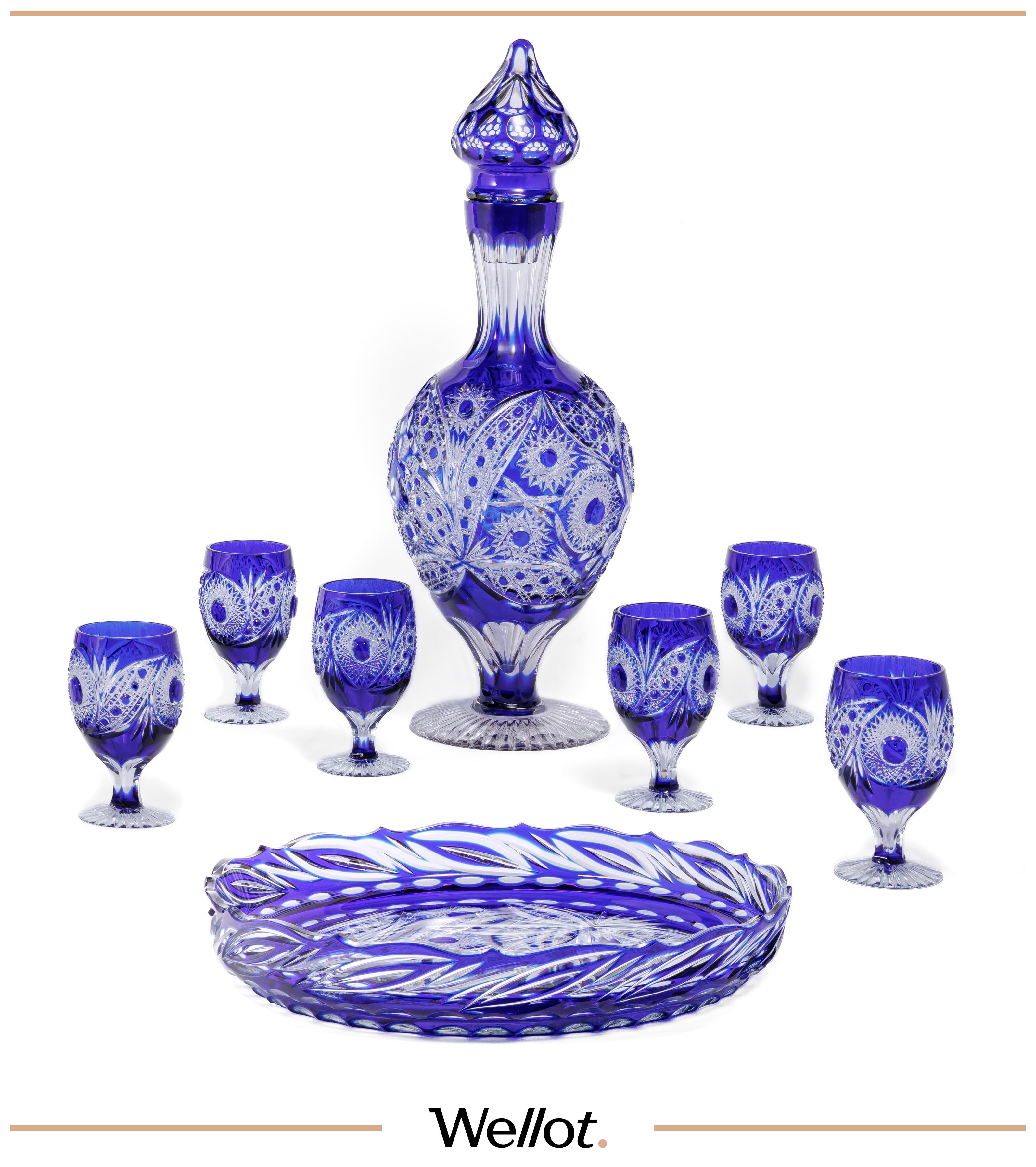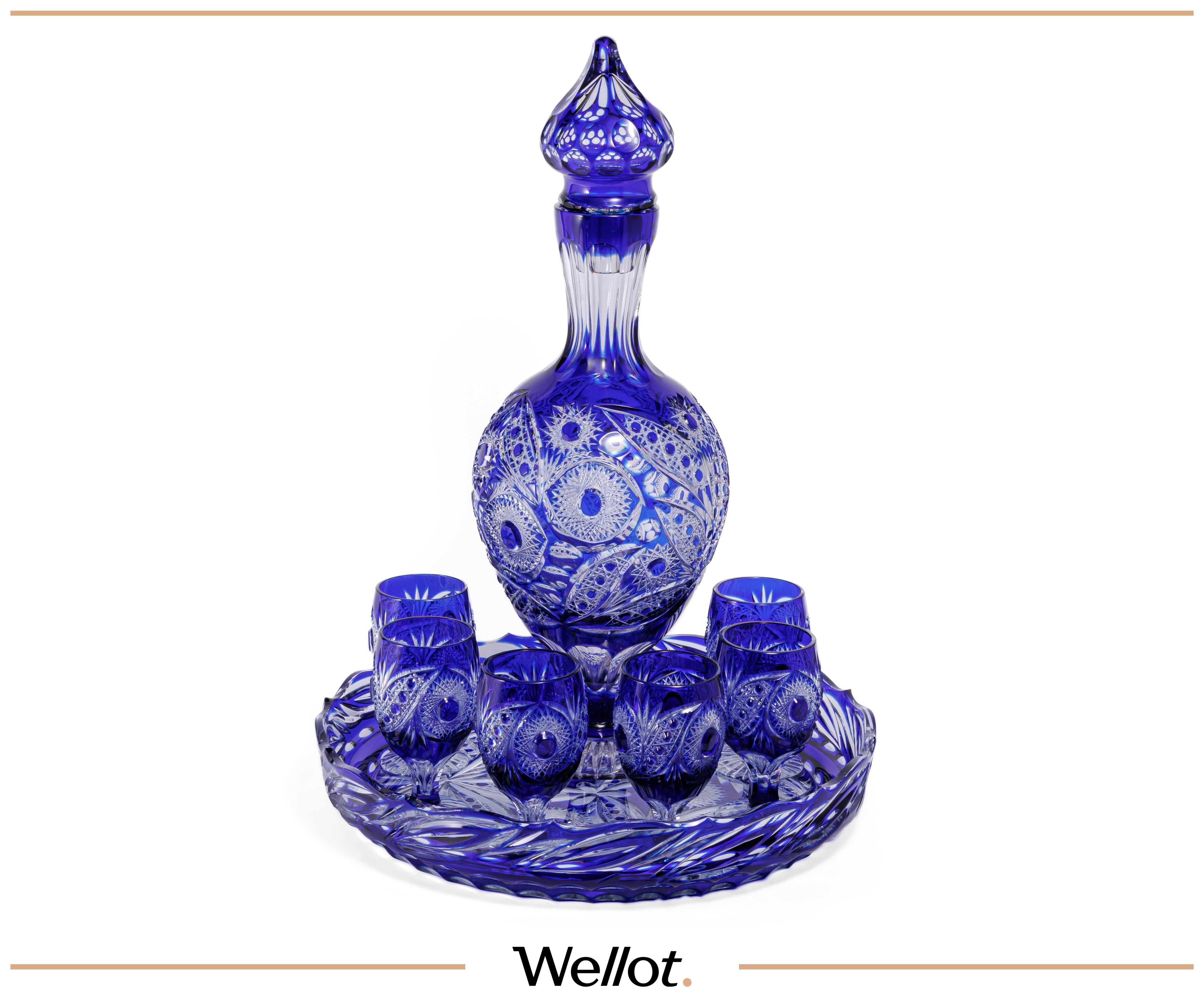 Тема коллекционирования: хрусталь. Размер бокала: диаметр 7,5 см, высота 13,5. Размер графина: диаметр 20 см, высота 52 см. Диаметр подноса 39 см. Изготовлен на знаменитом Гусевском хрустальном заводе, начало 1990-х гг. Предмет из старой частной коллекции. Гусевский хрустальный завод, основанный в XIX веке, известен высоким качеством и художественной выразительностью своих изделий. Работы мастерской начала 1990‑х годов ценятся за смелые дизайнерские решения и превосходную обработку материала. Ваза сочетает авторскую уникальность, высокое мастерское исполнение и историческую значимость, являясь выдающимся примером советско-российского художественного стеклоделия. Штучный, нетиражный предмет!